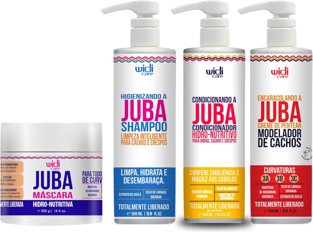 Este é um kit da Widicare que acompanha quatro produtos: um shampoo, um condicionador, um creme de pentear e uma máscara. Ambos são da linha Juba, especializada em cabelos cacheados e crespos.